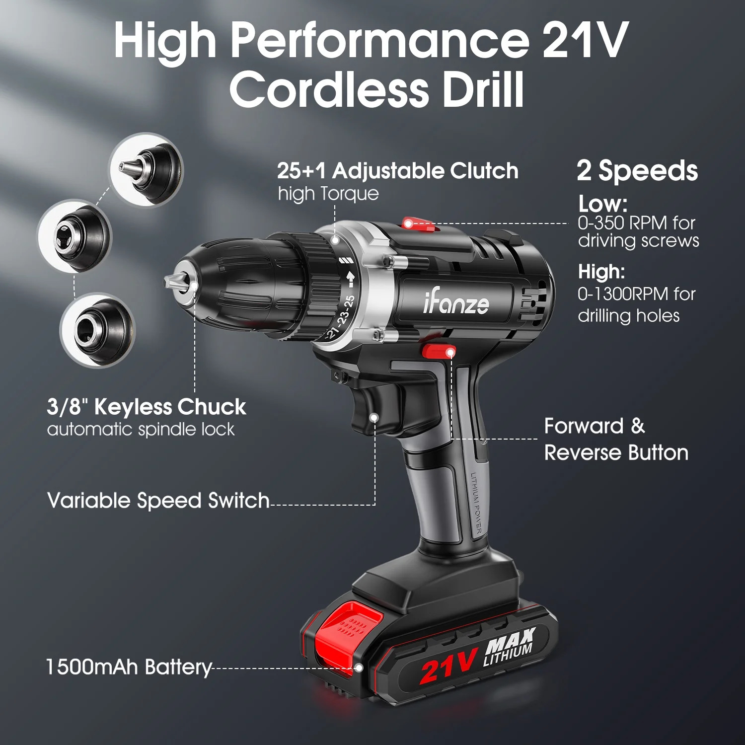 • Powerful Performance: 21V cordless drill delivers high torque with 2 variable speeds (0-350 & 0-1350 RPM) for versatile use on wood, metal, plastic, and more.