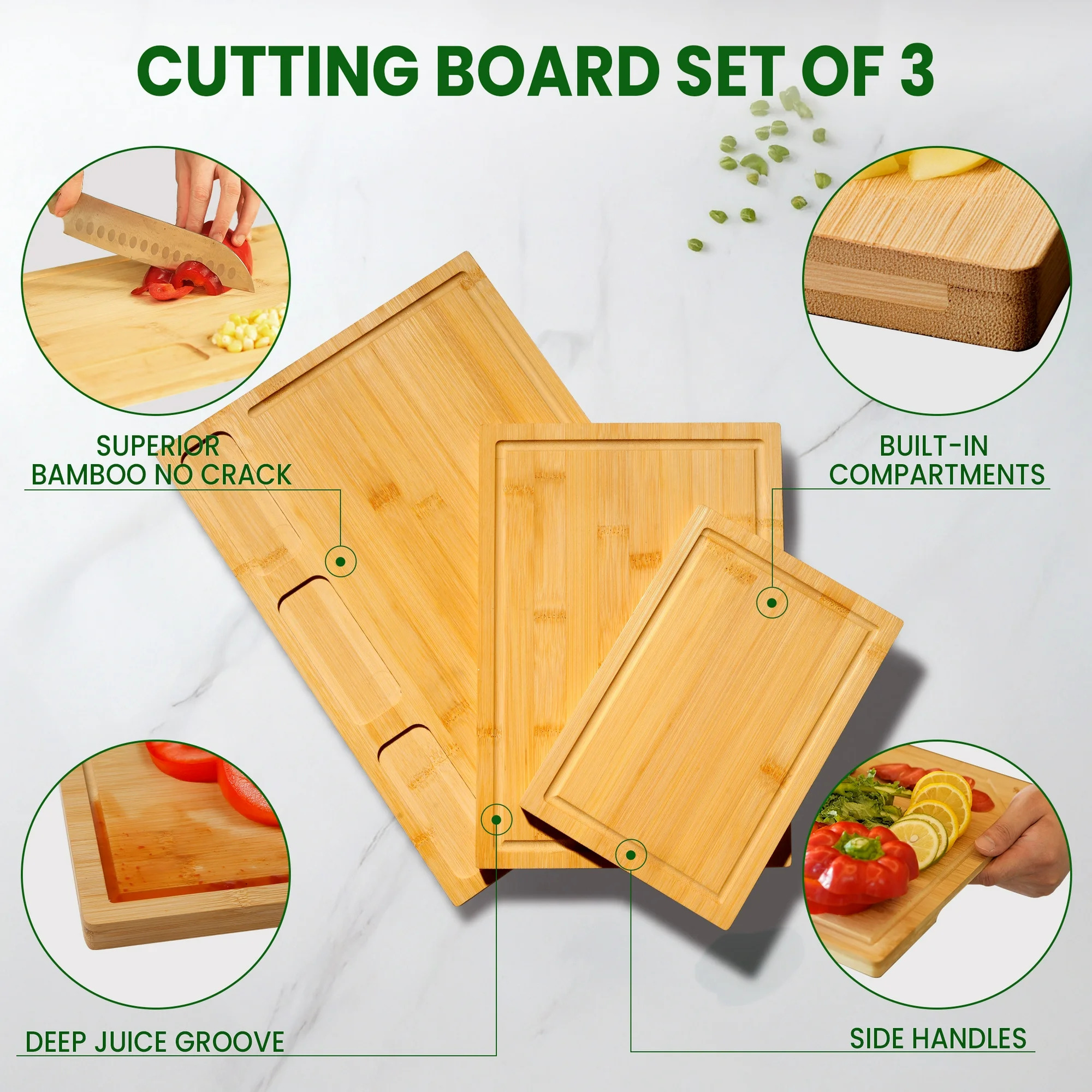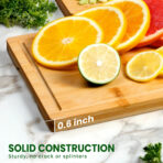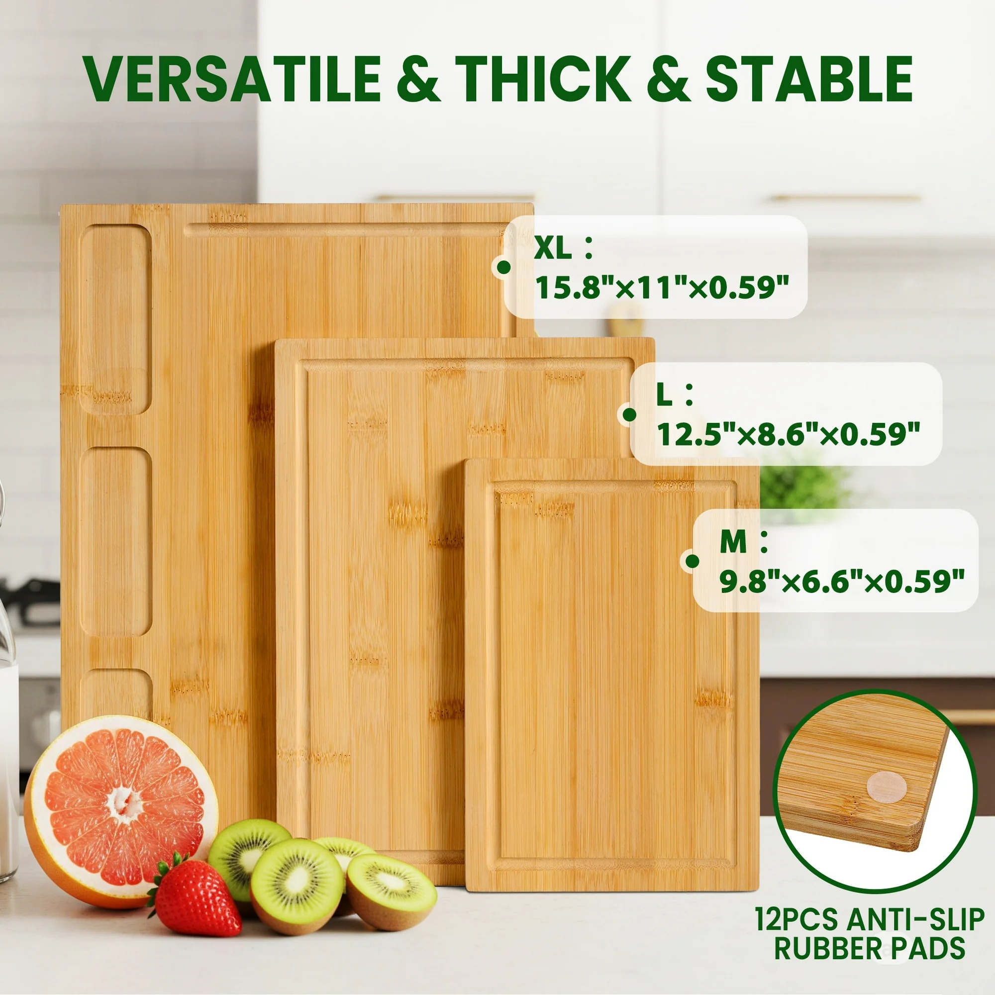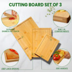 - Versatile Sizing: This set includes three bamboo chopping boards: an extra-large (15.8″ x 11.0″ x 0.59″) with compartments, a large (12.5″ x 8.6″ x 0.59″) for meat/vegetables, and a medium (9.8″ x 6.6″ x 0.59″) for fruit.